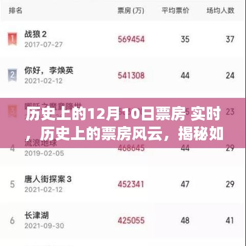 随着电影产业的蓬勃发展,越来越多的人对电影票房数据产生了浓厚的兴趣,本文将指导初学者和进阶用户如何查询历史上的12月10日电影票房实时数据,让你轻松掌握查询技巧,深入了解电影市场的动态,请跟随我们的步骤,一起探索这个充满魅力的领域吧!