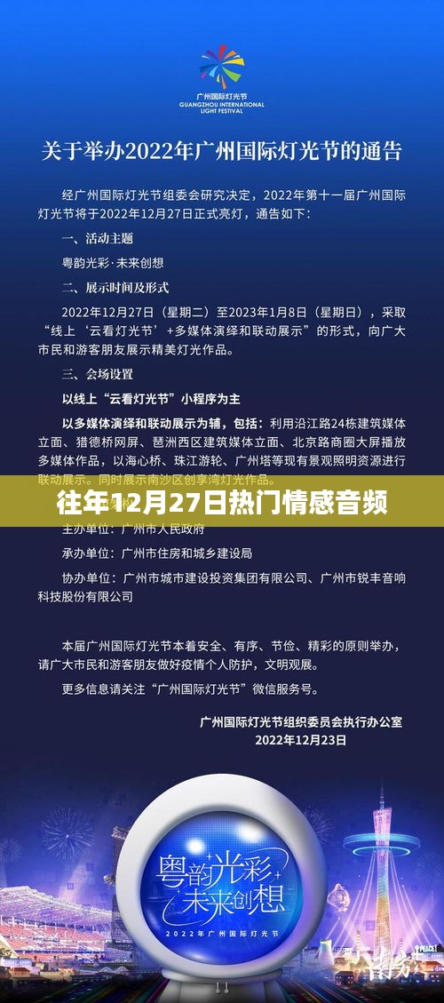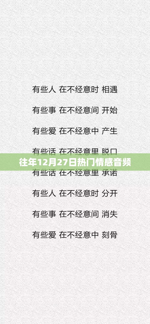 每年的12月27日,都有许多动人的情感音频问世,它们以深情的旋律和真挚的歌词,打动了无数听众的心灵,这些音频或许是某个热门影视作品的插曲,或许是由知名歌手倾情演绎的力作,它们共同构成了这一天独特的音乐氛围,本文将带你回顾往年12月27日的热门情感音频,感受那些令人心动的瞬间。