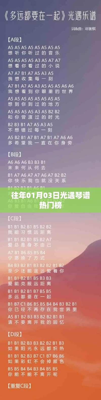 在浩瀚的网络世界中,音乐游戏《光遇》以其独特的艺术风格和游戏玩法吸引了无数玩家,游戏中的琴谱更是成为了一大亮点,许多玩家热衷于探索和研究各种琴谱,以此表达自己的音乐情感,本文旨在回顾往年1月3日《光遇》琴谱的热门榜单,探寻那些深受玩家喜爱的经典琴谱及其背后的故事。