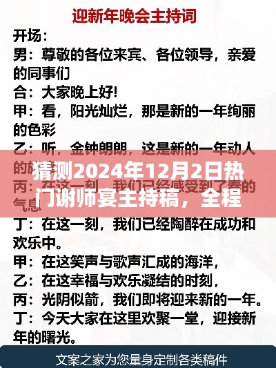 摘要:,,本文预测了2024年热门谢师宴主持稿的内容,并提供全程撰写指南。从初学者到进阶,本文详细介绍了如何撰写一篇优秀的主持稿。包括开场白的吸引力、对老师和学生的感谢表达、节目安排的流畅性、宴会的氛围营造以及结束语的得体等方面。本文旨在为想要撰写谢师宴主持稿的人提供有价值的参考和建议。